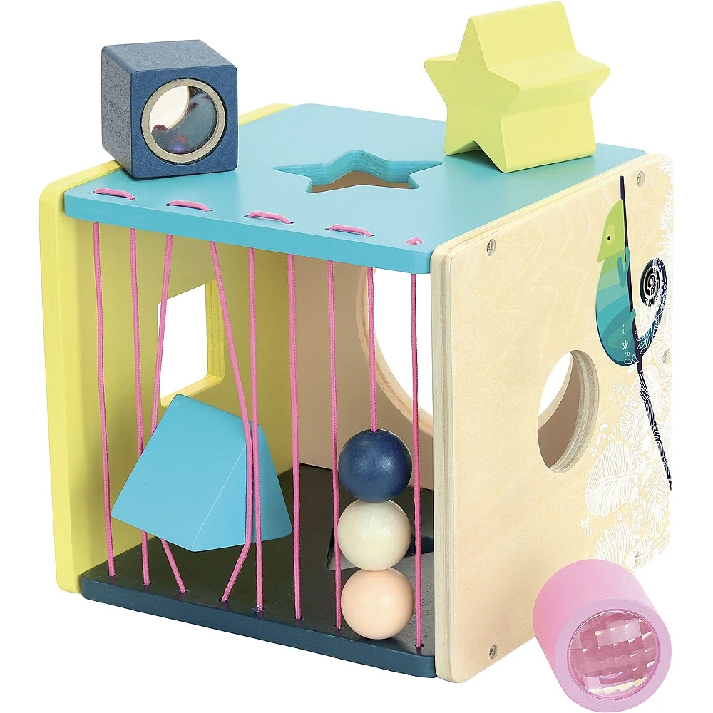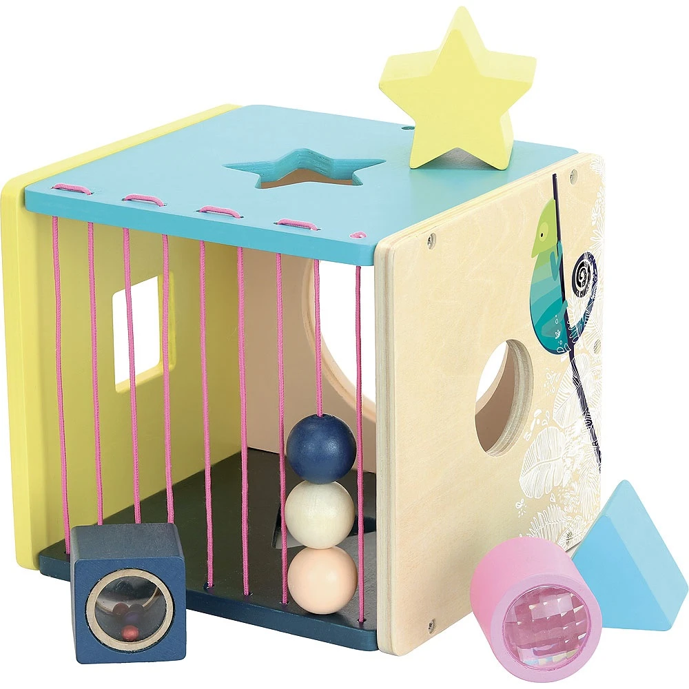 Des jolies pièces en bois à manipuler et à encastrer dans une boite à formes aux couleurs naturelles et pétillantes. Les 4 accessoires ludiques amuseront bébé : un cylindre kaléidoscope, un cube maracas, une étoile et un triangle sonore.