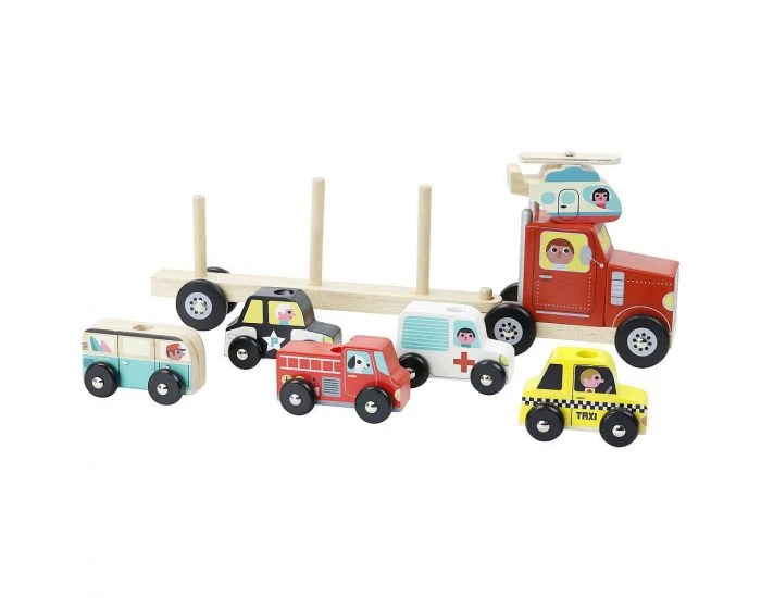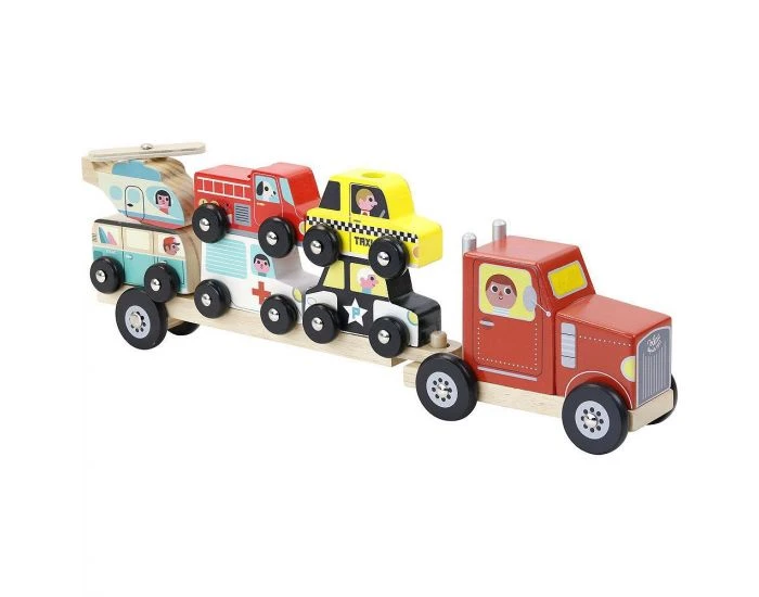 Un jouet en bois composé d’un camion et de six véhicules : une ambulance, un camion de pompiers, une voiture de police, un taxi, un bus et un hélicoptère.