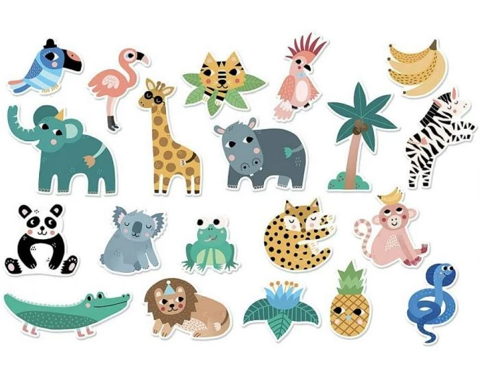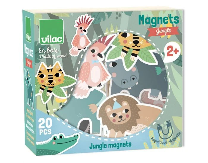 Coffret de 20 magnets joliment illustrés par Michelle Carlslund pour découvrir les animaux de la jungle.
