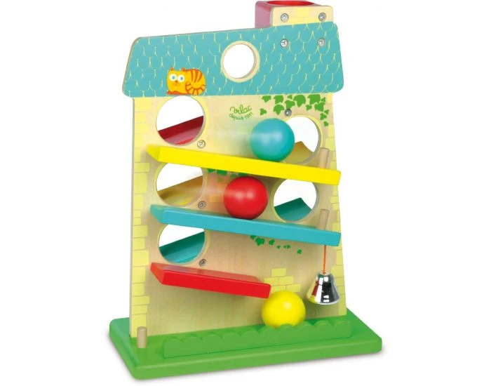Une jolie maison en bois amusante avec des boules qui roulent, tombent et font sonner la cloche !
