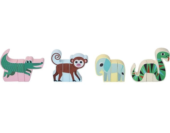 Quatre animaux de la jungle en bois à recomposer grâce aux 12 éléments aimantés détachables qui peuvent être mélangés pour créer des animaux imaginaires très amusants.